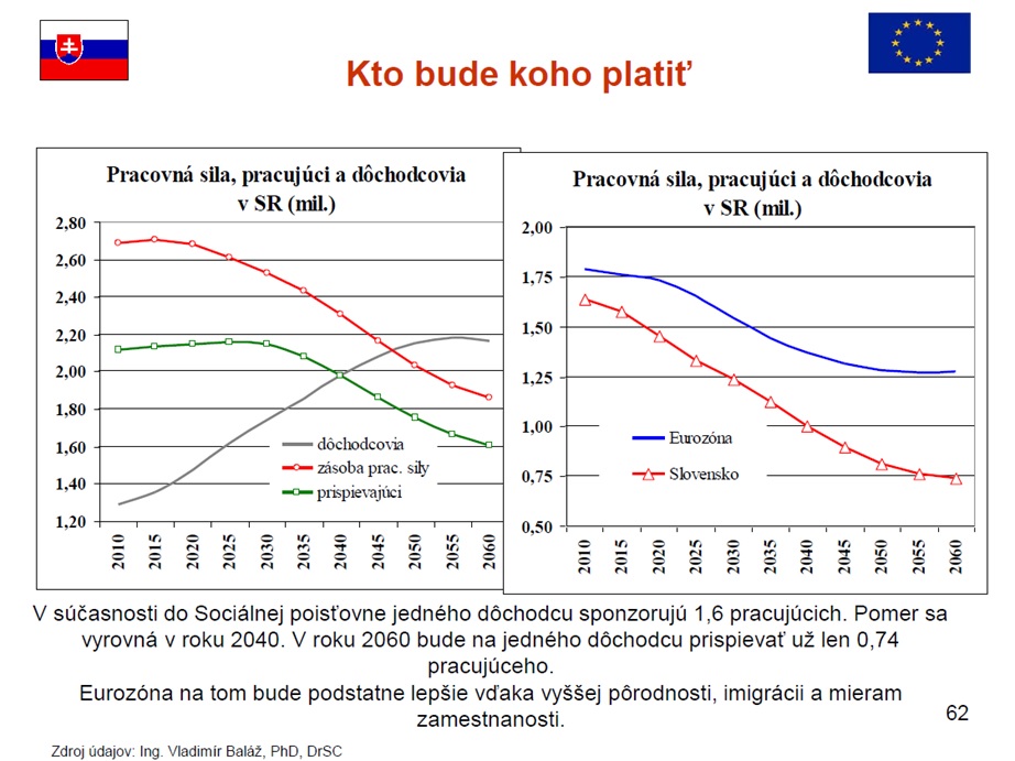 Priemerná výška dôchodku je dnes na úrovni cca 417 eur, priemerná hrubá mzda na Slovensku predstavuje cca 900 eur, z čoho priemerný odvod do 1. piliera je cca 162 eur. Už dnes sociálna poisťovňa pri týchto číslach generuje záporné hodnoty v príjmoch. Čo nastane ak pomer pracujúcich a dôchodcov sa bude rok od roka vyrovnávať, nechám na posúdení každého z vás...